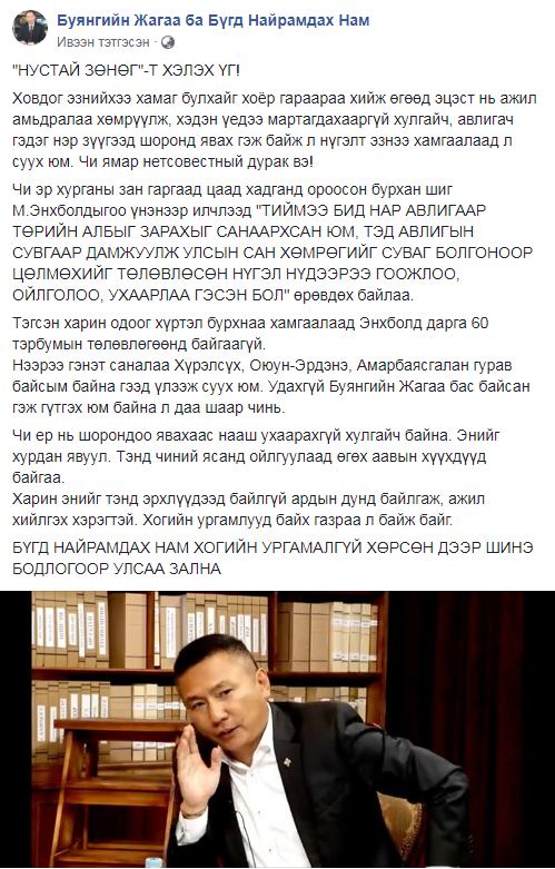 Чи эр хурганы зан гаргаад цаад хадганд ороосон бурхан шиг М.Энхболдыгоо үнэнээр илчлээд "ТИЙМЭЭ БИД НАР АВЛИГААР ТӨРИЙН АЛБЫГ ЗАРАХЫГ САНААРХСАН ЮМ, ТЭД АВЛИГЫН СУВГААР ДАМЖУУЛЖ УЛСЫН САН ХӨМРӨГИЙГ СУВАГ БОЛГОНООР ЦӨЛМӨХИЙГ ТӨЛӨВЛӨСӨН НҮГЭЛ НҮДЭЭРЭЭ ГООЖЛОО, ОЙЛГОЛОО, УХААРЛАА ГЭСЭН БОЛ" өрөвдөх байлаа.